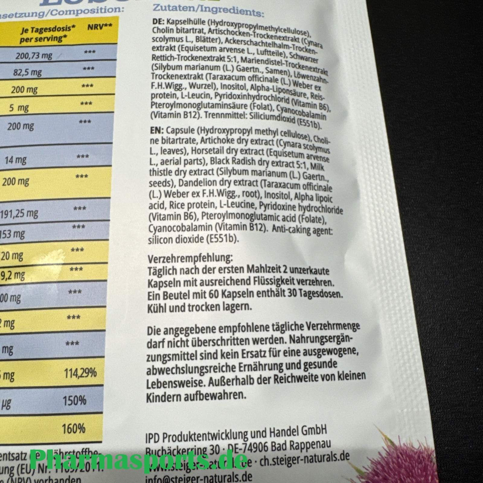 Entdecken Sie das original Leber Produkt von Steiger Naturals Naturhof Natürliche Inhaltsstoffe: Unser Leber Produkt enthält eine einzigartige Kombination aus Mariendistel, Artischocke, Zinnkraut (Ackerschachtelhalm) und Löwenzahn. Diese natürlichen Extrakte sind sorgfältig ausgewählt. Hohe Bioverfügbarkeit: Die Formel von Steiger Naturals bietet höchste Bioverfügbarkeit durch die Kombination von essentiellen Vitaminen (B6, B12, B9) und Mineralien wie Kieselsäure und Cholin. Dies stellt sicher, dass Ihr Körper die wertvollen Nährstoffe optimal aufnehmen kann. Für Leber & Stoffwechsel: Cholin trägt zur Aufrechterhaltung einer normalen Leberfunktion bei. Cholin trägt zu einem normalen Fettstoffwechsel bei. Rein & Vegan: Unser Leber Präparat ist frei von Zusatzstoffen und Süßungsmitteln. Sie ist vegan, laktosefrei und glutenfrei. Natürlich ohne Tierversuche hergestellt. Qualität aus Deutschland: Bei Steiger Naturals steht Qualität an erster Stelle. Unsere Produkte werden in Deutschland hergestellt und laborgeprüft. Dies garantiert Ihnen höchste Qualität und Sicherheit bei jeder Einnahme. Mit der Steiger Naturals Naturhof Leber Nahrungsergänzungsmittel investieren Sie in ein hochwertiges Produkt. Jede Packung enthält 60 Kapseln, die für eine Monatskur ausreichen. Starten Sie noch heute und unterstützen Sie Ihre Gesundheit auf natürliche Weise. Mehr infos zu Leberkur erhaltet ihr im Shop. In der Kategorie: Produkte für die Leber