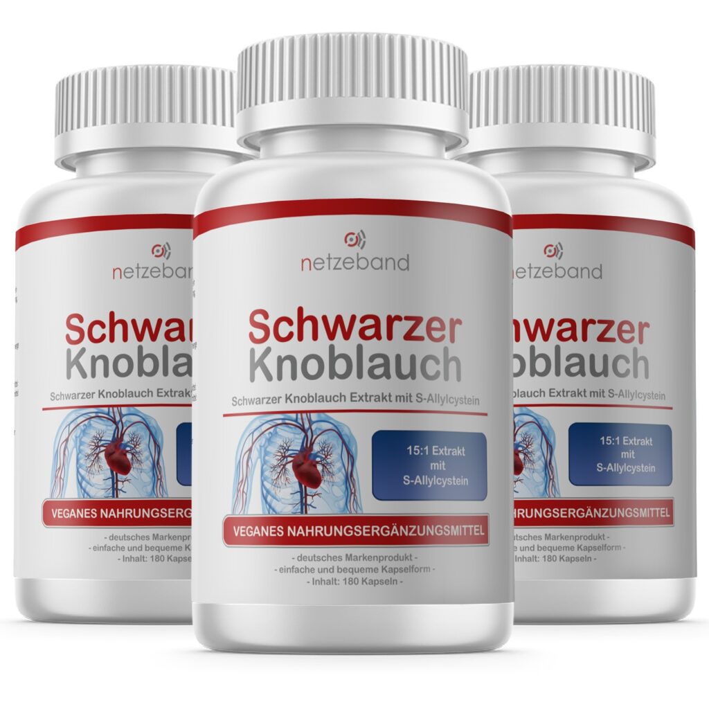 Pro Dose Netzeband Schwarzer Knoblauch findet sich ein Inhalt von 180 Kapseln, der zugleich 180 Tagesportionen á 1 Kapsel entspricht. Über den bekannten beißenden Knoblauch-Geruch braucht der Anwender sich keine Sorgen machen, da dieser durch Fermentation der Vergangenheit angehören. Pro Kapsel findet sich in dieser hochwertigen Nahrungsergänzung eine Menge von 750 Milligramm schwarzer Knoblauch 15:1 Extrakt (davon 0,75 Milligramm S-Allylcystein). Durch unser aufwendiges Extraktionsverfahren, ist es uns möglich Ihnen in nur einer veganen Kapsel 750mg Schwarzer Knoblauch Extrakt welche 11.250 mg schwarzen Knoblauch entsprechen. Das verarbeitete Extrakt verfügt über eine hohe Bioverfügbarkeit und kann vom menschlichen Organismus bestens verwertet werden.